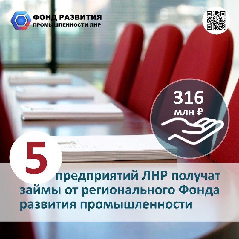 Экспертный совет Фонда развития промышленности ЛНР одобрил предоставление льготных займов 5 предприятиям Республики. Общая сумма финансирования составит 316 млн руб.