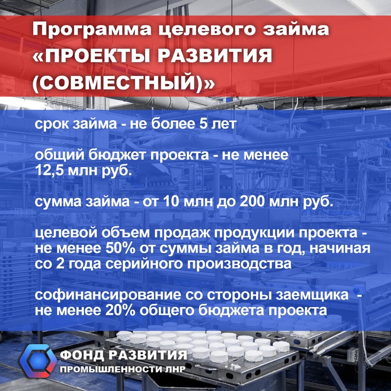 В Фонде развития промышленности ЛНР утвердили новую программу «Проекты развития (совместный)», займы по которой будут выдаваться предприятиям Республики на условиях софинансирования федеральным и региональным ФРП.