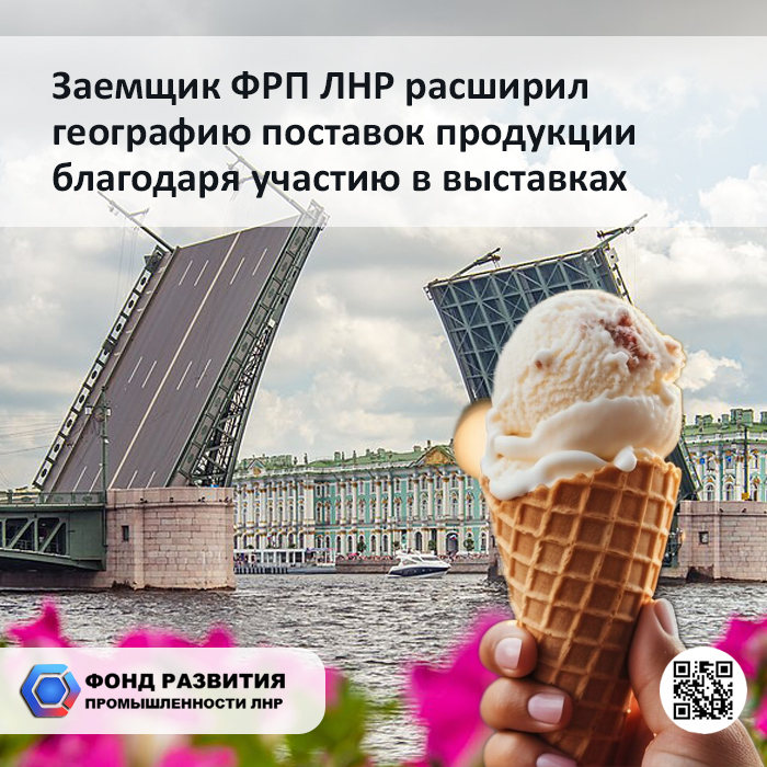 Луганский производитель мороженого, ставший в прошлом году заемщиком регионального Фонда развития промышленности, смог расширить географию поставок своей продукции благодаря участию в конгрессно-выставочных мероприятиях. Об этом сообщила заместитель председателя Правительства ЛНР Светлана Подлипаева.