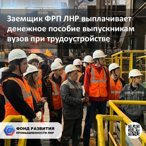 На алчевском заводе, входящем в состав компании-заемщика ФРП ЛНР, выплачивают 120 тыс. руб. выпускникам вузов в качестве разового пособия при трудоустройстве. Об этом рассказали в администрации города.